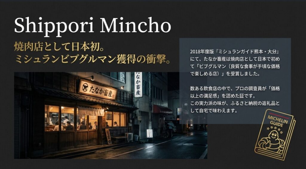 田中畜産は、2018年度の『ミシュランガイド熊本・大分』において、焼肉店として日本で初めて「ビブグルマン」を受賞しました 。