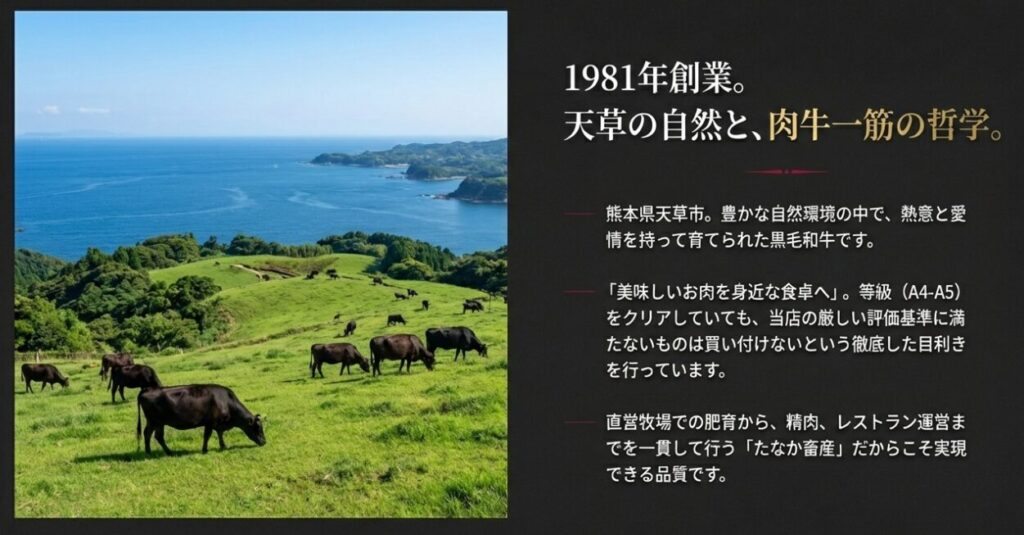 - 圧倒的な希少性: 年間400頭しか生産されない「天草黒牛」という、ここでしか味わえない価値 。
