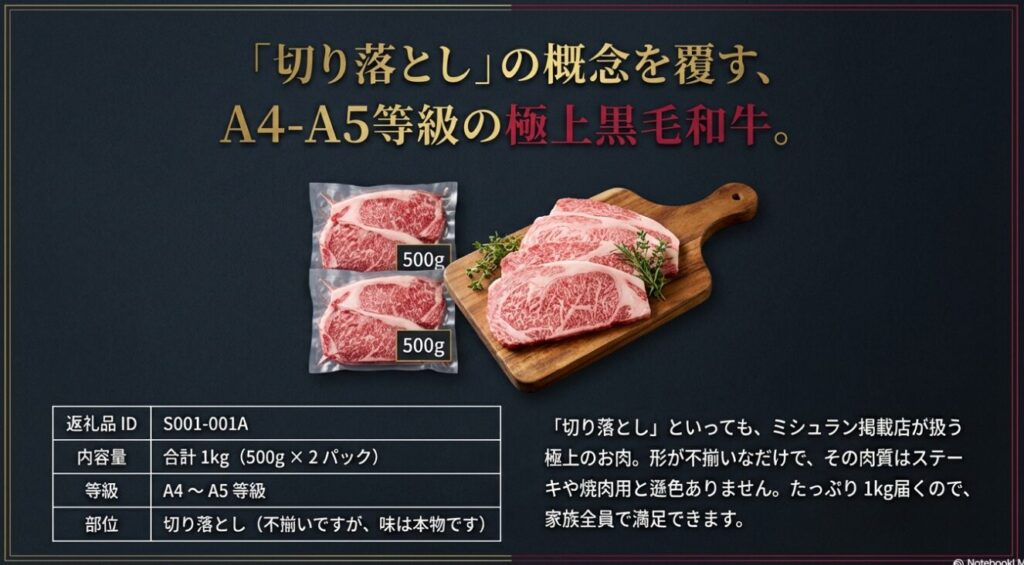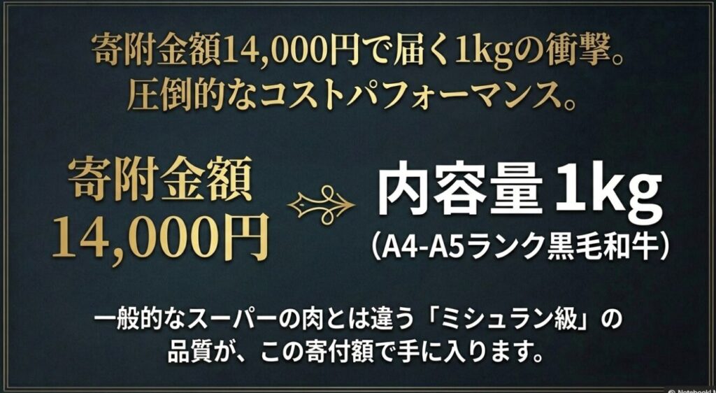 - 圧倒的コスパ: 1万円台の寄付で、最高級和牛がたっぷり届く