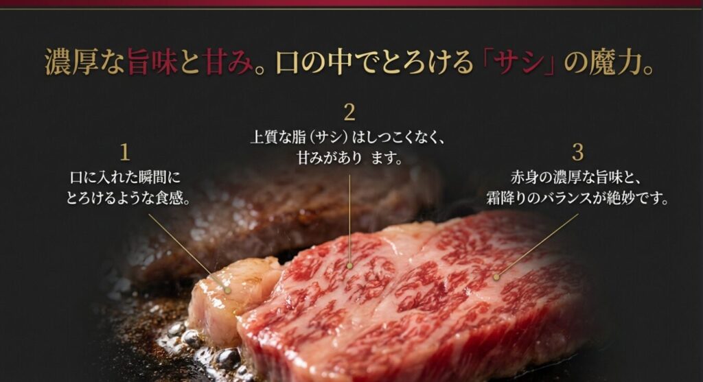 その特徴は、きめ細やかなサシ(霜降り)がありながら、脂がさっぱりとしていて、肉本来の旨味が濃厚なこと 。