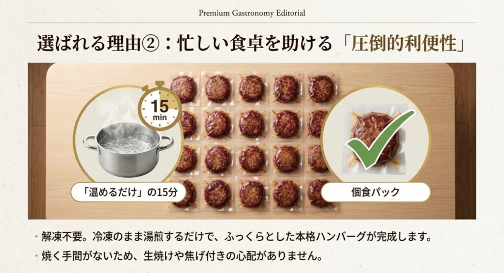 「冷蔵庫に何もないけれど、冷凍庫にこのハンバーグがある」という安心感は、忙しいパパ・ママにとって最高のベネフィットになるはずです 。