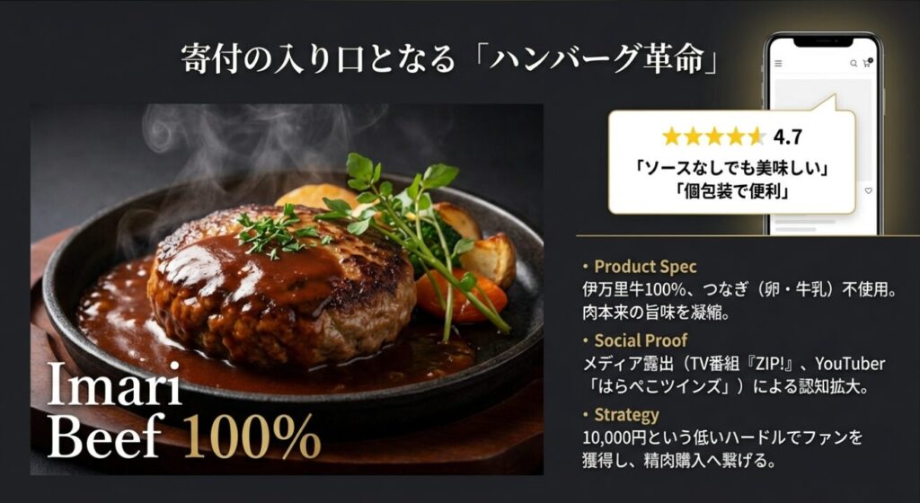 | 時短・手軽さ | 伊万里牛100%ハンバーグ | つなぎ不使用でプロの味がすぐ完成した! |