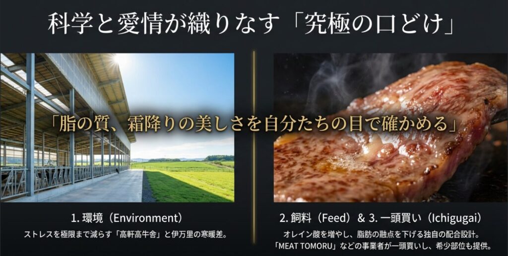ここからは、伊万里牛がなぜそこまで美味しいのか、3つのポイントでわかりやすく紹介するね!