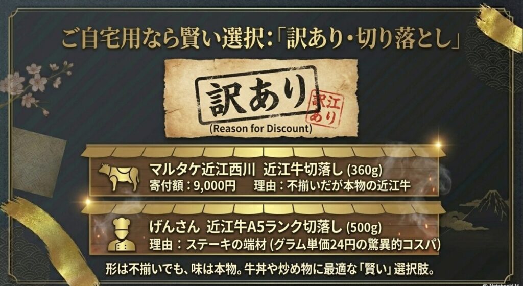 | 訳あり肉 | 大きさや形が不揃いなだけで味は一級品の近江牛 | とにかく量をたくさん食べたい育ち盛りのお子様がいる家庭 |