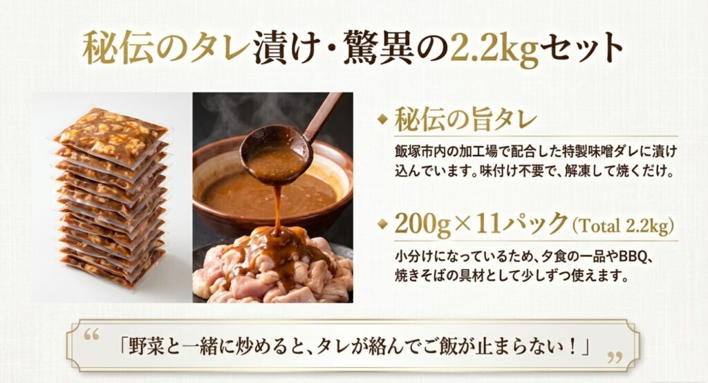 2.2kgという驚異のボリュームと、中毒性のある「秘伝の旨タレ」が口コミで話題を呼び、リピーターが続出しています 。