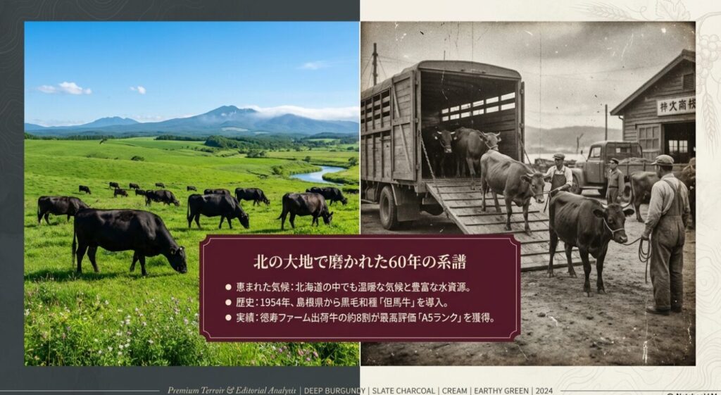 白老町は北海道の中でも比較的温暖な気候に恵まれていて、豊かな水資源とともに黒毛和牛の飼育にとっても向いた地域なんだよね。