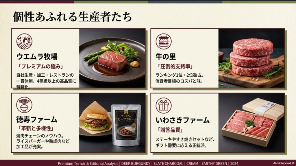 - 品質・記念日重視:ウエムラ牧場のステーキや、いわさきファームのすき焼きがおすすめ!