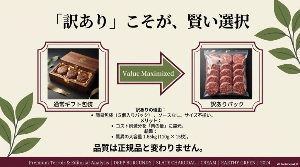 大人気の「訳ありハンバーグ」も、品質ではなく梱包コストを削ることで実現したお得な一品だから、ご自宅用であればこれ以上ない選択肢だよ!
