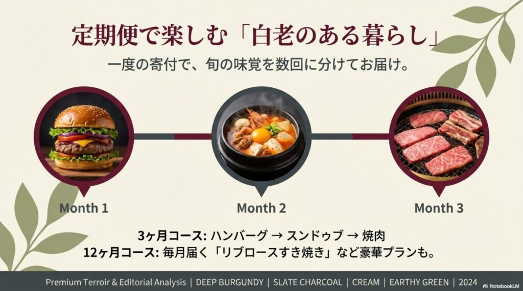 白老町の定期便は「期間」と「届く内容」のバリエーションがとても豊富で、ご家庭の消費ペースや好みに合わせて無駄なく選べるのが最大の魅力だったよ!