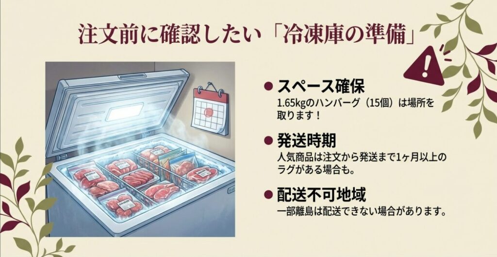 また、冷凍庫に届いたお肉を入れるスペースを事前に確保しておくことも、美味しく食べるための大切な準備の一つだよ!