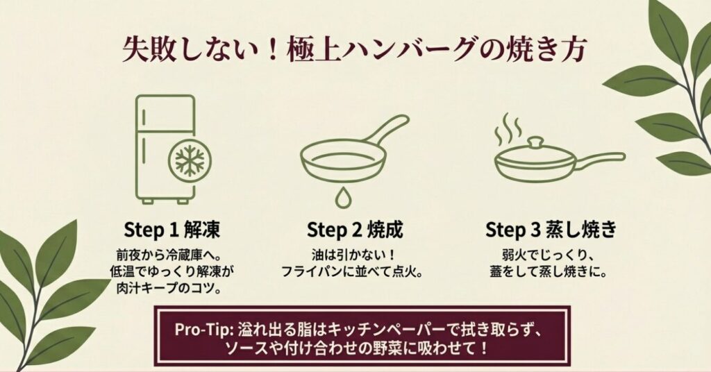 - 失敗しないコツ:前日から冷蔵庫でゆっくり解凍して、油を引かずに弱火でじっくり焼くこと!