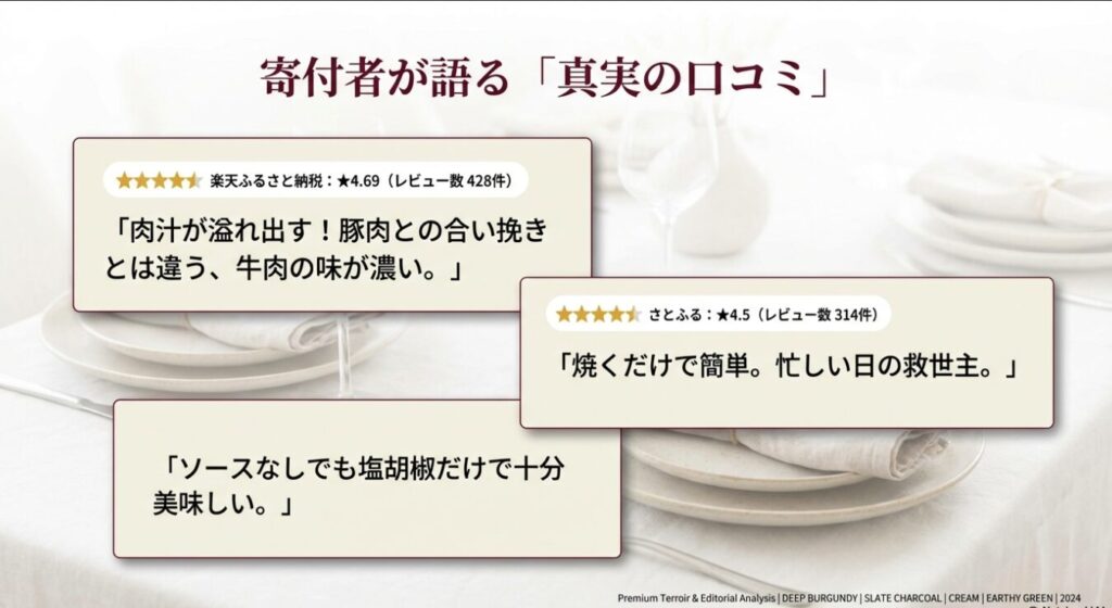 だからこそ実現できる鮮度と品質の高さは圧倒的で、寄付者のレビューでも「今まで食べたステーキの中で一番美味しかった!」という感動の声が溢れていたよ。