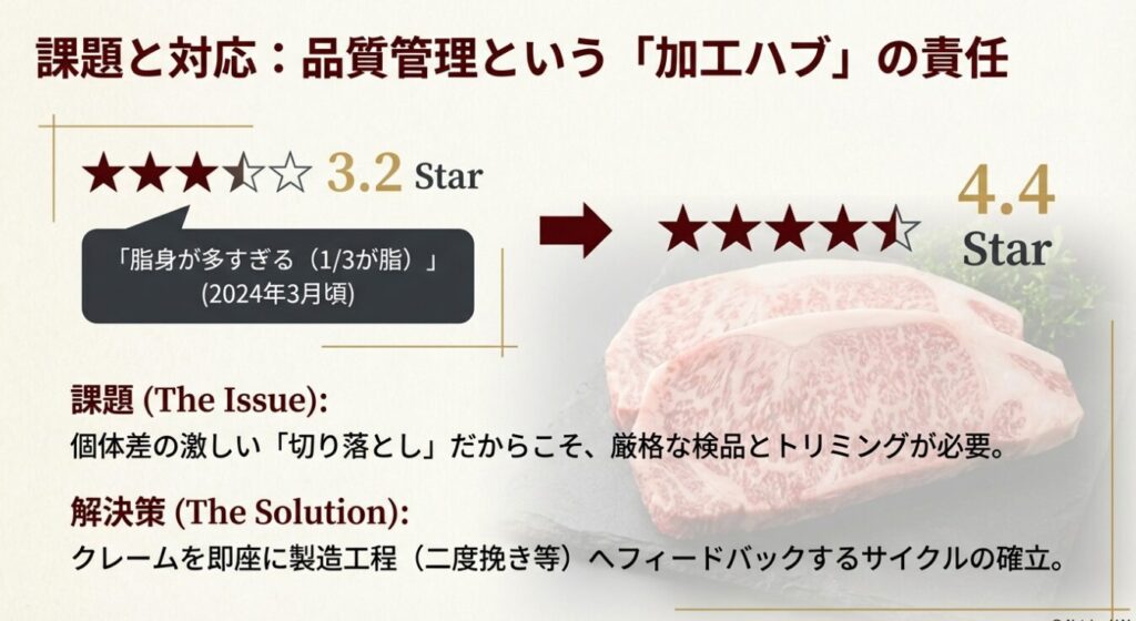 須恵町側も消費者のレビューを真剣に受け止めて、お肉をカットする時の品質チェックを強化する対策を取ってたよ!