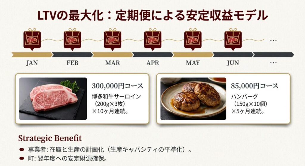 例えば「300,000円コース」なら、1年間を通じて博多和牛の高級ステーキを味わうという極上のライフスタイルが手に入ったよ!