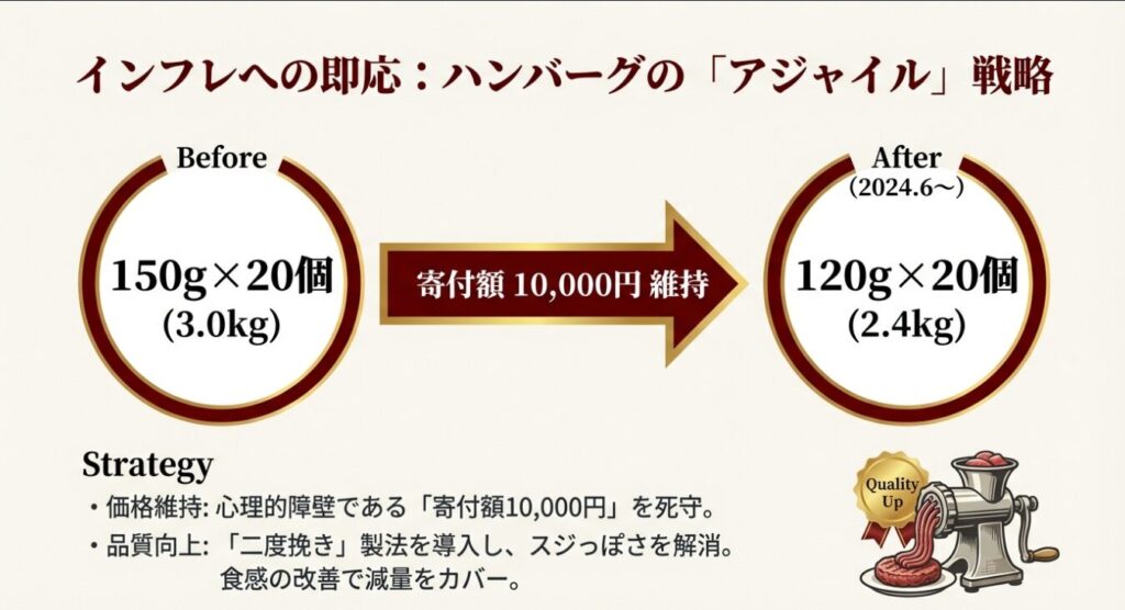 寄附金額1万円を維持しながら「圧倒的な美味しさ」へと進化させるための前向きな企業努力だったんだ!